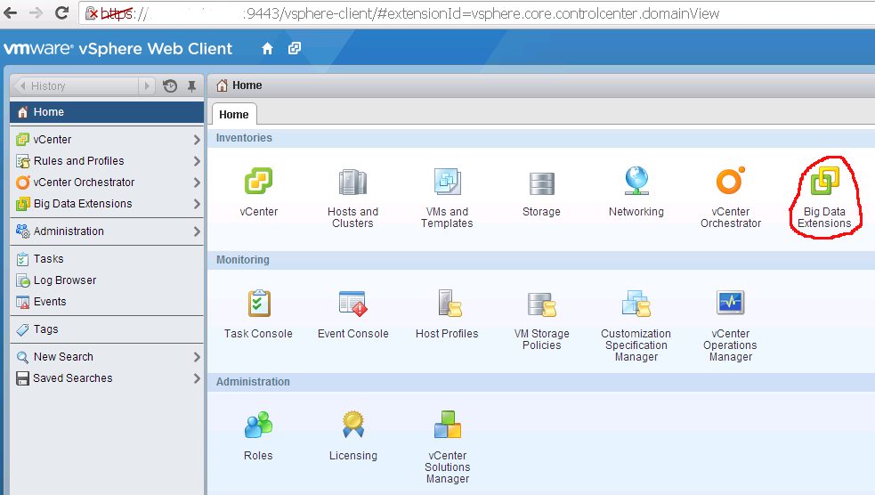 After deploying Serengeti Management Server using OVF, it would be possible to install Big Data Extensions plugin in vCenter Server. Follow the instructions for doing this. After a Logout and Login (necessary), you will see Big Data Extensions plugin in vSphere Web Client Home, Inventories.